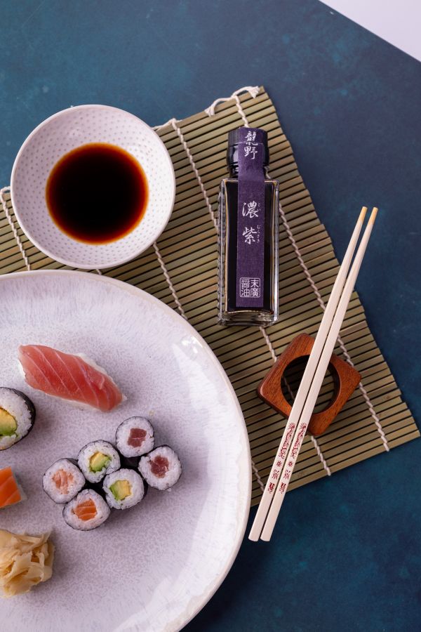 Dunkles Purpur ist eine Sandanshikomi Shoyu mit einer leicht sirupartigen Struktur. Sandanshikomi steht für die 3-Phasen-Fermentation. Durch diese längere Fermentation bekommt die Shoyu nicht nur eine dunklere Farbe, sondern auch eine besondere Geschmackstiefe.